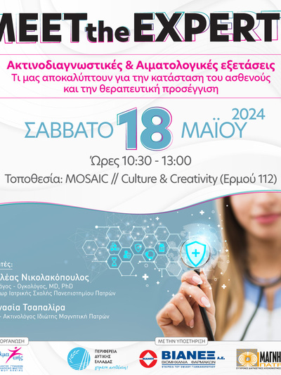 Το Σάββατο 18 Μαΐου 2024 και ώρες 10:30-13:00 θα πραγματοποιηθεί η 2η συνάντηση με θέμα: «Ακτινοδιαγνωστικές & Αιματολογικές εξετάσεις – Τι μας αποκαλύπτουν για την κατάσταση του ασθενούς και την θεραπευτική προσέγγιση» με ομιλητές τον κο Αχιλλέα Νικολακόπουλο - Παθολόγο - Ογκολόγο, MD, PhD Διδάκτωρ Ιατρικής Σχολής Πανεπιστημίου Πατρών και την κα Αθανασία Τσαπαλίρα- Ιατρό- Ακτινολόγο Ιδιώτη στην Μαγνητική Πατρών.