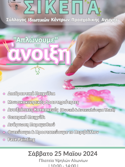 Θεατρικό παιχνίδι, face painting, δημιουργία (κολιέ, βραχιόλια, καρφίτσες και ανοιξιάτικα καπέλα), ζωγραφική σε πέτρες και άλλα διάφορα υλικά, διαδραστικά παιχνίδια, μουσικοκινητική, μπαλονο-κατασκευές, ανοιξιάτικα καδράσκια με τεχνική Ψηφιδωτού, κηπουρική είναι μερικά απ΄όσα θα συμβούν.