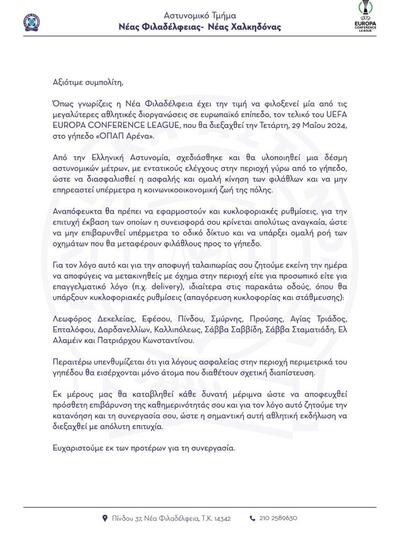 Επιπλέον, η αστυνομία ενημερώνει τους πολίτες που διαμένουν στην εν λόγω περιοχή, σχετικά με τα μέτρα ασφαλείας και τις κυκλοφοριακές ρυθμίσεις που θα τεθούν σε ισχύ, με το αστυνομικό Τμήμα Νέας Φιλαδέλφειας - Νέας Χαλκηδόνας να μοιράζει στους πολίτες φυλλάδιο.
