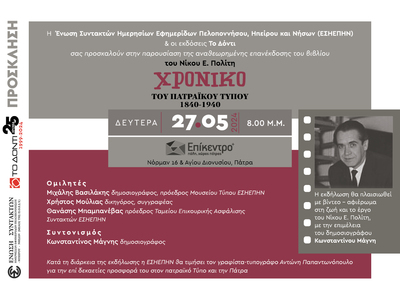 Πρόκειται για το βιβλίο του Νίκου Ε. Πολίτη «Χρονικό του πατραϊκού Τύπου (1840-1940)» που κυκλοφόρησε πριν λίγες μέρες σε δεύτερη αναθεωρημένη έκδοση. Η παρουσίαση θα πραγματοποιηθεί τη Δευτέρα, 27 Μαΐου 2024, ώρα 8.00 μ.μ. στο θέατρο «Επίκεντρο+» (Νόρμαν 16 και Αγίου Διονυσίου).