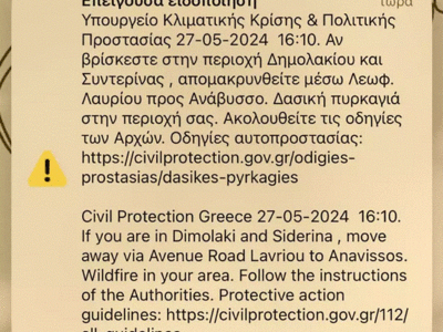 Πριν από λίγο εστάλη μήνυμα 112 στους κατοίκους στο Δημολάκι αλλά και στον γειτονικό οικισμό της Συντερίνας να απομακρυνθούν μέσω της λεωφόρου Λαυρίου προς Ανάβυσσο.