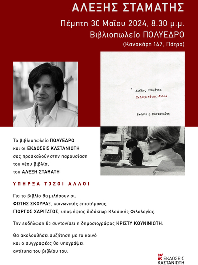 Για το βιβλίο θα μιλήσουν ο Φώτης Σκούρας, κοινωνικός επιστήμονας και ο Γιώργος Χαριτάτος, υποψήφιος διδάκτωρ Κλασικής Φιλολογίας . Την εκδήλωση θα συντονίσει η Κρίστυ Κουνινιώτη.