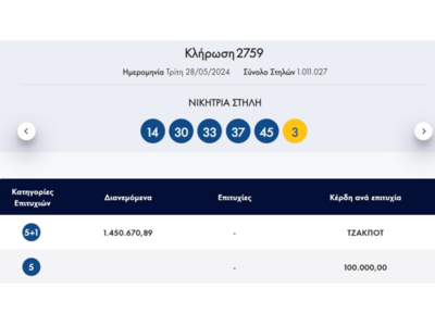 Τζακ ποτ είχαμε στην κλήρωση του Τζόκερ την Τρίτη (28/5), η οποία μοίραζε 1,45 εκατ. στην πρώτη κατηγορία.