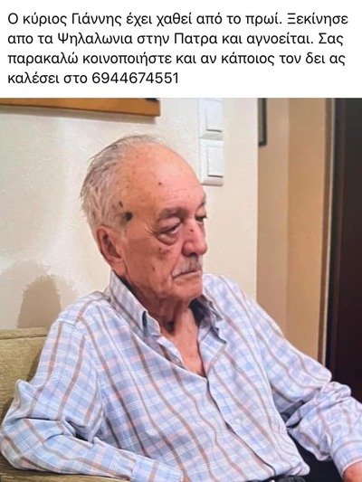Χάθηκε ο κυρ Γιάννης, με τους δικούς του να αγωνιούν για τον εντοπισμό του.