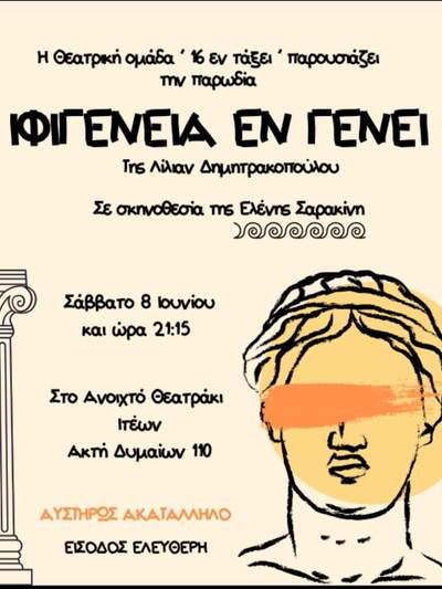 Αυτό το Σάββατο 8-6-2024 και ώρα 21:15 στο Ανοιχτό θεατράκι Ιτεών φιλοξενείται η ερασιτεχνική θεατρική ομάδα "16 εν τάξει", η οποία θα παρουσιάσει την ξεκαρδιστική παρωδία "Ιφιγένεια εν γένει" της Δήμητρας Δημητρακοπούλου σε σκηνοθεσία της Ελένης Σαρακίνη.