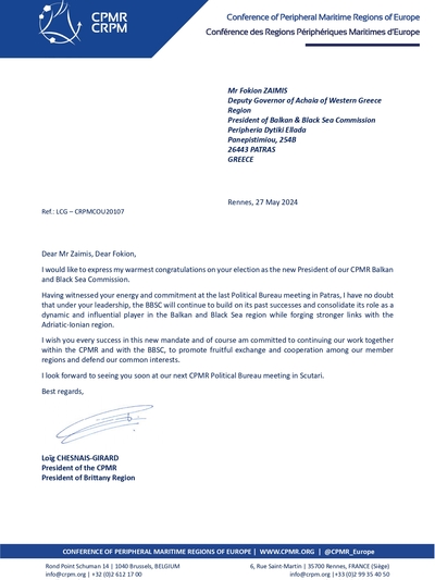 Τα συγχαρητήριά του μετέφερε και γραπτώς, μέσω σχετικής επιστολής, στον Αντιπεριφερειάρχη Αχαΐας Φωκίωνα Ζαΐμη, για την εκλογή του ως Προέδρου της Επιτροπής Βαλκανίων και Ευξείνου Πόντου της CPMR, ο πρόεδρος της CPMR και Περιφερειάρχης Βρετάνης, στη Γαλλία, κ. Loïg Chesnais-Girard.