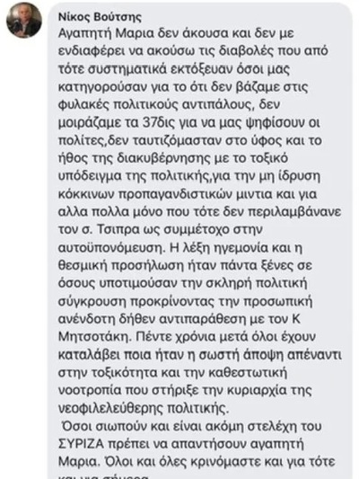 «Δεν άκουσα και δεν με ενδιαφέρει να ακούσω τις διαβολές που συστηματικά εκτόξευαν όσοι μας κατηγορούσαν για το ότι δεν βάζαμε στις φυλακές πολιτικούς αντιπάλους, δεν μοιράζαμε τα 37 δις για να μας ψηφίσουν οι πολίτες, δεν ταυτιζόμασταν στο ύφος και το ήθος της διακυβέρνησης με το τοξικό υπόδειγμα της πολιτικής όπως για την μη ίδρυση “κόκκινων” προπαγανδιστικών μίντια αλλά και για άλλα πολλά», υπογραμμίζει σε ανάρτησή του στα κοινωνικά δίκτυα ο τέως πρόεδρος της Βουλής, Νίκος Βούτσης σχολιάζοντας τις δηλώσεις του Θανάση Οικονόμου κατά στελεχών του ΣΥΡΙΖΑ που συμμετείχαν στην Επιτροπή ελέγχου «πόθεν έσχες» της Βουλής.