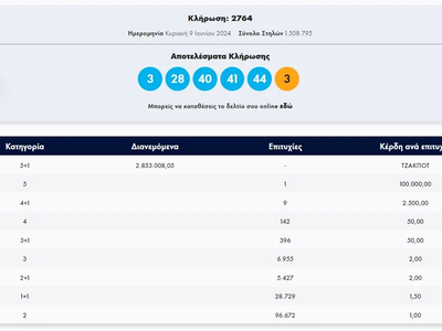 Στην Κλήρωση Τζόκερ, την Κυριακή 9/6/2024 (αριθμός κλήρωσης 2764), οι τυχεροί αριθμοί ήταν οι εξής: