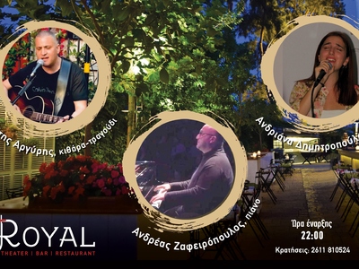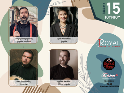 Tο καλοκαιρινό Steak & Beer Bar στον κήπο του Royal, υποδέχεται την Παρασκευή 14 Ιουνίου, στις 10 το βράδυ, τον Αργύρη Μανιάτη (κιθάρα τραγούδι), την Ανδριάνα Δημητροπούλου (τραγούδι) και τον Ανδρέα Ζαφειρόπουλο (πιάνο),αναλαμβάνοντας να μας διασκεδάσουν με ένα πρόγραμμα βασισμένο στην ελληνική και ξένη μουσική σκηνή.