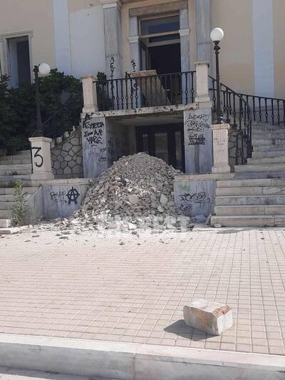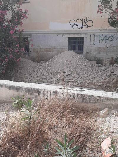 Όπως υποστηρίζουν οι εργάτες πετούν τα μπάζα περιμετρικά του κτιρίου, χωρίς τους ανάλογους κάδους, με αποτέλεσμα η σκόνη που δημιουργείται να πνίγει την περιοχή και κυρίως τα σπίτια γύρω από το κτίριο.