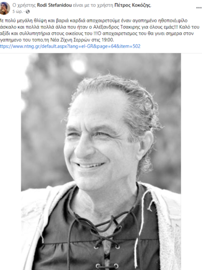 Τη δυσάρεστη είδηση έκαναν γνωστή οι συνάδελφοί του στο Κρατικό Θέατρο Βορείου Ελλάδος, Λίλα Βλαχοπούλου και Ρόδη Στεφανίδου, με αναρτήσεις.