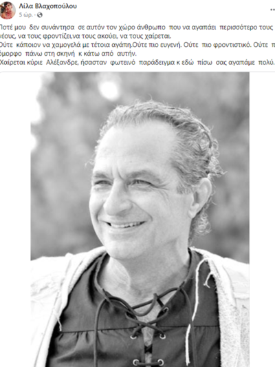 Χαρακτηριστικά, η Λίλα Βλαχοπούλου έγραψε: «Ποτέ μου δεν συνάντησα σε αυτόν τον χώρο άνθρωπο που να αγαπάει περισσότερο τους νέους, να τους φροντίζει, να τους ακούει, να τους χαίρεται. Ούτε κάποιον να χαμογελά με τέτοια αγάπη. Ούτε πιο ευγενή. Ούτε πιο φροντιστικό. Ούτε πιο όμορφο πάνω στη σκηνή και κάτω από αυτήν. Χαίρεται κύριε Αλέξανδρε, ήσασταν φωτεινό παράδειγμα και εδώ πίσω σας αγαπάμε πολύ».