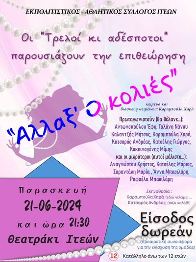 Αυτή την Παρασκευή 21 Ιουνίου 2024 και ώρα 21:30 στο Θεατράκι Ιτεών Πατρών με τη διοργάνωση του Εκπολιτιστικού Αθλητικού Συλλόγου Ιτεών, θα παρουσιαστεί η παράσταση επιθεώρησης με τίτλο "Αλλαξ' Ο κολιές".