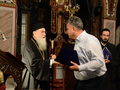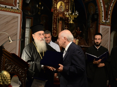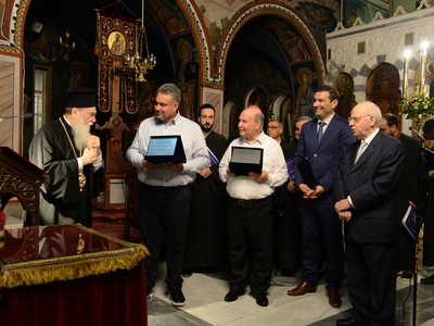 Κατόπιν, ο Μητροπολίτης Κορίνθου κ.κ. Διονύσιος απένειμε τιμητικές πλακέτες στους χοράρχες των φιλοξενούμενων χορωδιών και στον πρόεδρο της χορωδίας «Θεόδωρος Φωκαεύς», κ. Γεώργιο Βέργο.
