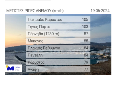 Στον παρακάτω πίνακα παρουσιάζονται οι οκτώ μεγαλύτερες ριπές του ανέμου έως τις 18:30 της Τετάρτης 19/06.