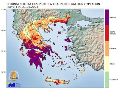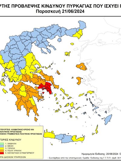 Ακραίος κίνδυνος πυρκαγιάς, για την Παρασκευή 21 Ιουνίου, προβλέπεται για την Αττική σύμφωνα με τον Χάρτη Πρόβλεψης Κινδύνου Πυρκαγιάς που εκδίδει η Γενική Γραμματεία Πολιτικής Προστασίας του υπουργείου Κλιματικής Κρίσης & Πολιτικής Προστασίας.