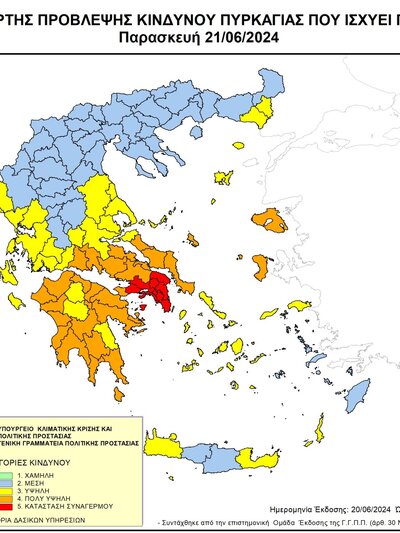 Σε κατάσταση κινητοποίησης (Red Code) την Παρασκευή 21 Ιουνίου τίθενται οι Περιφέρειες Στερεάς Ελλάδας, Πελοποννήσου, Βορείου Αιγαίου και Δυτικής Ελλάδας, με απόφαση του Γενικού Γραμματέα Πολιτικής Προστασίας κ. Βασίλη Παπαγεωργίου, λόγω του πολύ υψηλού κινδύνου εκδήλωσης πυρκαγιάς στις εν λόγω περιοχές σύμφωνα με τον Ημερήσιο Χάρτη Πρόβλεψης Κινδύνου Πυρκαγιών της ΓΓΠΠ.