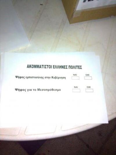 10.50 Μια ακόμα κινητοποίηση έκαναν χθες Αγανακτισμένοι της Πάτρας. Το καθιερωμένο ραντεβού είχε δοθεί για τις 7 το απόγευμα στην πλατεία Γεωργίου, όπου είχαν στηθεί κάλπες και υπήρχαν και ψηφοδέλτια με την επιλογή του ναι ή όχι σχετικά με τα: Ψήφος εμπιστοσύνης στην κυβέρνηση, Ψήφος για το Μεσοπρόθεσμο".