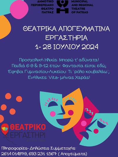 Το Θεατρικό Εργαστήρι του ΔΗ.ΠΕ.ΘΕ. Πάτρας, διοργανώνει από την 1η έως τις 28 Ιουλίου 2024, καλοκαιρινά θεατρικά εργαστήρια για όλες τις ηλικίες. Στόχος όπως αναφέρει η σχετική ανακοίνωση, είναι η θεατρική εκπαίδευση σε συμπυκνωμένες δράσεις και συγκεκριμένες θεματικές.