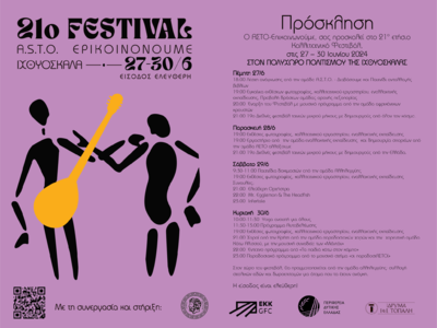 Ο δραστήριος εθελοντικός σύλλογος ΑΣΤΟ-Επικοινωνούμε, πραγματοποιεί για 21η χρονιά το ετήσιο Καλλιτεχνικό Φεστιβάλ, και θα γίνει στις 27 – 30 Ιουνίου 2024 στον πολυχώρο πολιτισμού της Ιχθυόσκαλας, όπως ανακοινώθηκε.