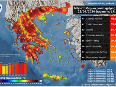 Η μέγιστη θερμοκρασία σημειώθηκε στη Γαβαλού Αιτωλοακαρνανίας και ήταν ίση με 40.5 ˚C. Στον παρακάτω χάρτη παρουσιάζονται οι μέγιστες θερμοκρασίες που καταγράφηκαν έως τις 17:00 του Σαββάτου 22/06 και στον πίνακα οι οκτώ μεγαλύτερες θερμοκρασίες.
