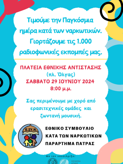 Το Παράρτημα Πάτρας του Εθνικού Συμβουλίου κατά των Ναρκωτικών τιμά την Παγκόσμια Ημέρα Κατά των Ναρκωτικών που, όπως έχει ορισθεί, είναι η 26η Ιουνίου.