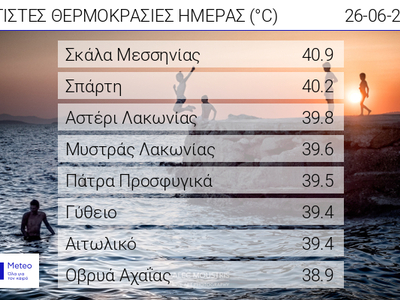 Ξεπέρασε τους 39 °C η θερμοκρασία στα δυτικά και νότια ηπειρωτικά την Τετάρτη 26/06/2024, με την υψηλότερη μέγιστη θερμοκρασία να καταγράφεται στη Σκάλα Μεσσηνίας με 40,9 °C.