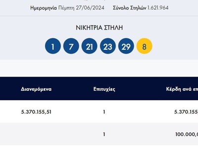 Οι αριθμοί που κληρώθηκαν είναι οι 1, 7, 21, 23, 29 και τζόκερ ο 8.