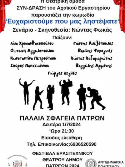 «Ευχαριστούμε που μας ληστέψατε» είναι ο τίτλος της σπονδυλωτής κωμωδίας που θα παρουσιάσει στις 9.30 το βράδυ την Δευτέρα 1η Ιουλίου 2024 στα Παλαιά Σφαγεία στην Ακτή Δυμαίων, για το Φεστιβάλ Ερασιτεχνικού Θεάτρου, το Αχαϊκό Εργαστήρι Πολιτισμού - Παράδοσης και η θεατρική του ομάδα συν-δραση.