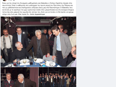 Αυτό, για να τονίσει ότι θα πρέπει να έχουμε στόχο στην ζωή μας. Μας τίμησε δυο φορές με την παρουσία του στις συγκεντρώσεις των συμμαθητών της πρώτης σειράς του Προτύπου της Πάτρας. Μας εξέπληξε φέρνοντας μαζί του το κόκκινο βιβλιαράκι με τα ονοματεπώνυμα μας και τους βαθμούς της εποχής εκείνης.