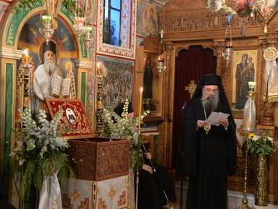 Στόν Ἑσπερινό, ἐχοροστάτησε ὁ Σεβασμιώτατος Μητροπολίτης Καισαριανῆς, Βύρωνος καί Ὑμηττοῦ κ. Δανιήλ, ὁ ὁποῖος, ἐμπνευσμένα καί μέ θεολογικό βάθος, ἐκήρυξε τόν θεῖο λόγο.