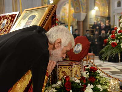 Στό Ἱερό Βῆμα παρέστη συμπροσευχόμενος ὁ Σεβασμιώτατος Γέροντας Μητροπολίτης, πρ. Καλαβρύτων καί Αἰγιαλείας κ. Ἀμβρόσιος.