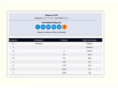 Πραγματοποιήθηκε η κλήρωση με αριθμό 2774 του Τζόκερ το βράδυ της Τρίτης (2/7) που μοιράζει ένα εκατομμύριο ευρώ στους νικητές της πρώτης κατηγορίας.