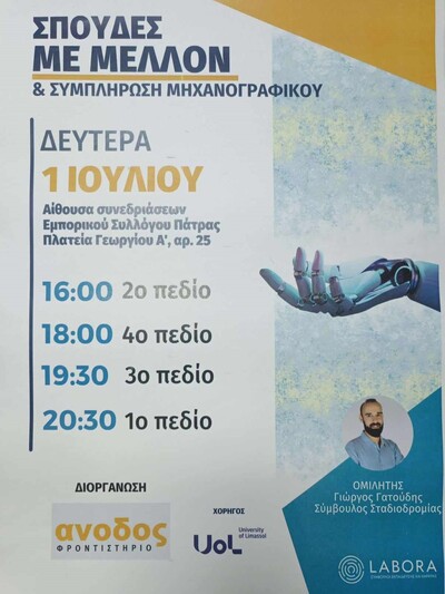 Το Φροντιστήριο Άνοδος στα πλαίσια της έγκαιρης και έγκυρης ενημέρωσης των μαθητών και των γονέων διοργάνωσε ημερίδα επαγγελματικού προσανατολισμού με τίτλο: "ΣΠΟΥΔΕΣ ΜΕ ΜΕΛΛΟΝ & ΣΥΜΠΛΗΡΩΣΗ ΜΗΧΑΝΟΓΡΑΦΙΚΟΥ", σε συνεργασία με την επιστημονική ομάδα της LABORA - Σύμβουλοι Εκπαίδευσης (www.labora.gr).