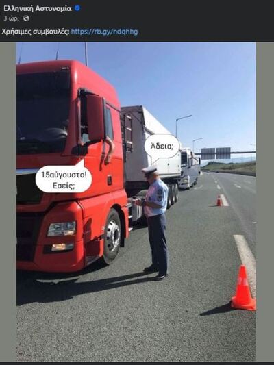 Στη φωτογραφία φαίνεται ο έλεγχος που γίνεται σε νταλίκα, με τον αστυνομικό να ρωτάει «άδεια;» και τον οδηγό να απαντά «15αύγουστο. Εσείς;».