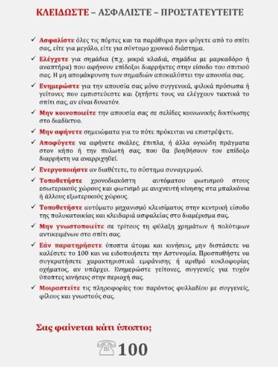 -Σε περίπτωση που ενημερωθείτε από γείτονες, φιλικά ή συγγενικά σας πρόσωπα ότι παρατηρούν κάτι ύποπτο στην οικία σας µη διστάσετε να ειδοποιήστε το “100” ή το Αστυνοµικό Τµήµα της περιοχής σας.