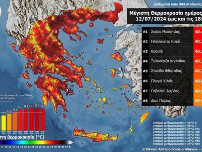 Όπως φαίνεται στον χάρτη της εικόνας που ακολουθεί, η μέγιστη θερμοκρασία την Παρασκευή (12/7) καταγράφηκε στη Σκάλα Μεσσηνίας και ήταν ίση με 40.4°C.