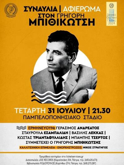 Ο κύκλος των αφιερωμάτων του Διεθνούς Φεστιβάλ Πάτρας στους μεγάλους Έλληνες ερμηνευτές συνεχίζεται την Τετάρτη 31 Ιουλίου 2024 στις 9.30 το βράδυ στο Παμπελοποννησιακό στάδιο, με τη συναυλία για τον σπουδαίο Γρηγόρη Μπιθικώτση.