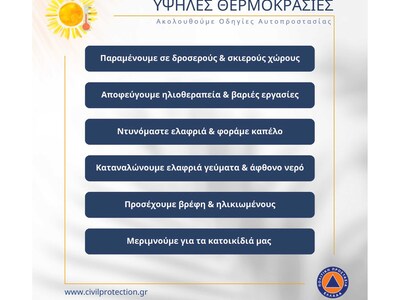 Ειδικότερα, το επικαιροποιημένο Έκτακτο Δελτίο Επιδείνωσης Καιρού που εκδόθηκε την Παρασκευή 19/7/2024 από την Εθνική Μετεωρολογική Υπηρεσία, αναφέρει ότι οι πολύ υψηλές θερμοκρασίες με μέγιστες τιμές τοπικά πάνω από τους 40 βαθμούς Κελσίου θα διατηρηθούν στη χώρα μας μέχρι τη Δευτέρα (22-7-2024). Από την Τρίτη θα υπάρξει βαθμιαία υποχώρηση της θερμοκρασίας, τόσο ως προς τις μέγιστες όσο και ως προς τις ελάχιστες τιμές, που θα γίνει αισθητή στα μέσα της ερχόμενης εβδομάδος στις περισσότερες περιοχές.