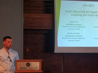 Επιπλέον οι τελειόφοιτοι φοιτητές Ιωάννης και Χρήστος Γκίνη παρουσίασαν την εργασία με τίτλο «Smart Recycling Bin based on Machine Learning and Multi Sensoring». Η παρούσα εργασία αφορά σε έναν νέο έξυπνο κάδο ανακύκλωσης που ενσωματώνει κάμερες, αισθητήρες ανίχνευσης ήχου, βάρους, ογκομέτρησης εφοδιασμένο με τεχνολογίες μηχανικής μάθησης και Διαδικτύου των Πραγμάτων (IoT) για τη βελτιστοποίηση της διαλογής απορριμμάτων. Είναι σχεδιασμένη τόσο για οικιακή όσο και για δημόσια χρήση, ενώ η τεχνολογία με την οποία είναι εφοδιασμένη προσαρμόζεται σε διαφορετικά περιβάλλοντα, εξασφαλίζοντας ευελιξία και αποτελεσματικότητα.