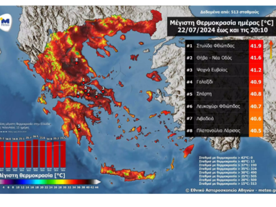 Σύμφωνα με τα στοιχεία του meteo.gr/ Εθνικού Αστεροσκοπείου Αθηνών, η θερμοκρασία ξεπέρασε τους 37 °C σε 189 από τους 513 επί του παρόντος ενεργούς σταθμούς (ποσοστό 37%) ενώ η μέση μέγιστη θερμοκρασία ήταν ίση με 35.5 °C, τιμή υψηλότερη αυτής της 20/07 (34.8 °C) και της 21/07 (35.2 °C).