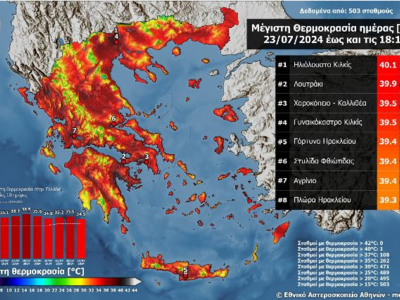 Η μέγιστη θερμοκρασία καταγράφηκε στο Ηλιόλουστο Κιλκίς (40.1 °C) και ακολούθησε το Λουτράκι (39.9 °C), το Χαροκόπειο - Καλλιθέα (39.5 °C) και το Γυναικόκαστρο Κιλκίς (39.5 °C).