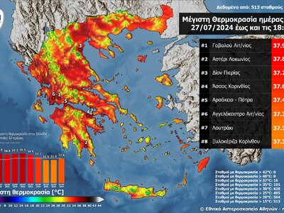 Μικρή άνοδος της θερμοκρασίας καταγράφηκε από το δίκτυο αυτόματων μετεωρολογικών σταθμών του meteo.gr/Εθνικού Αστεροσκοπείου Αθηνών το Σάββατο (27/07).
