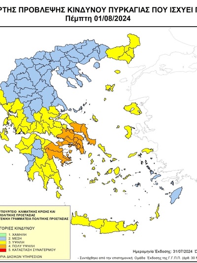 Πολύ υψηλός κίνδυνος πυρκαγιάς (κατηγορία κινδύνου 4) προβλέπεται αύριο στην περιφέρεια Αττικής καθώς και περιοχές της Στερεάς Ελλάδας και της Πελοποννήσου σύμφωνα με το Χάρτη Πρόβλεψης Κινδύνου Πυρκαγιάς που εκδίδει η γενική γραμματεία Πολιτικής Προστασίας του υπουργείου Κλιματικής Κρίσης και Πολιτικής Προστασίας.