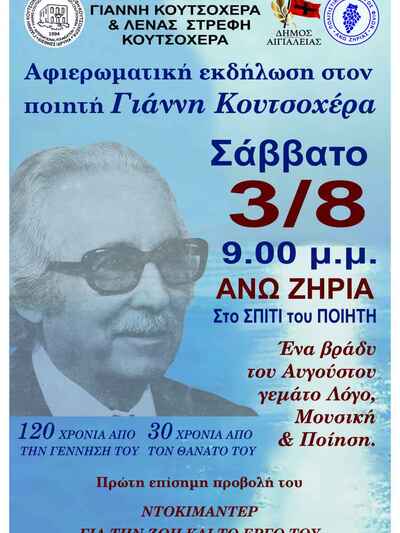 Το Διεθνές Ίδρυμα Γιάννη Κουτσοχέρα και Λένας Στρέφη, ο Δήμος Αιγιαλείας και οι Φίλοι Άνω Ζήρειας προσκαλούν το κοινό σε μία αφιερωματική εκδήλωση στη γραφική άνω Ζήρεια, για τον μεγάλο ποιητή Γιάννη Κουτσοχέρα.