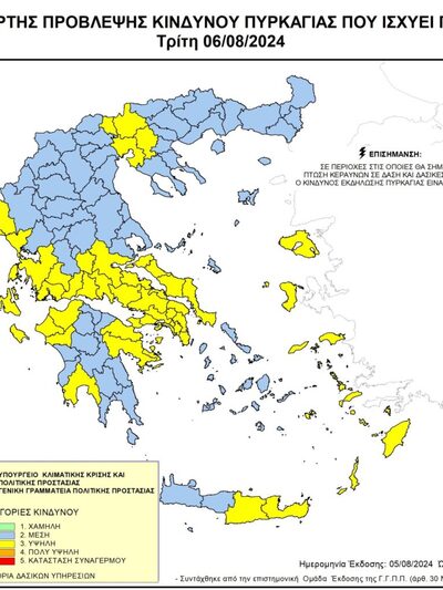 Yψηλός κίνδυνος πυρκαγιάς (κατηγορία κινδύνου 3) προβλέπεται για αύριο Τρίτη 6 Αυγούστου σε αρκετές Περιφέρειες της χώρας, σύμφωνα με το Χάρτη Πρόβλεψης Κινδύνου Πυρκαγιάς που εκδίδει η Γενική Γραμματεία Πολιτικής Προστασίας του υπουργείου Κλιματικής Κρίσης και Πολιτικής Προστασίας.