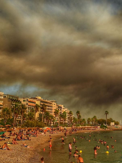 Σοκαριστική είναι η φωτογραφία που δείχνει μια παραλία της Αττικής γεμάτη με κόσμο, αλλά τον ουρανό να έχει ένα... απόκοσμο χρώμα, αφού οι καπνοί έχουν «σκεπάσει» την ατμόσφαιρα.