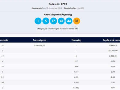 Έγινε η κλήρωση με αριθμό 2792 του ΤΖΟΚΕΡ το βράδυ της Τρίτης (13/08) που μοιράζει πάνω από 3.800.000 ευρώ στους νικητές της πρώτης κατηγορίας.
