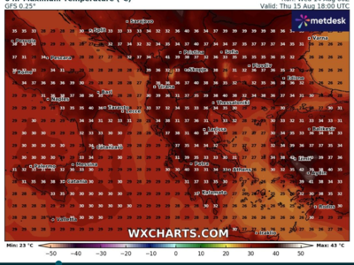 Οι αυριανές θερμοκρασίες σε χάρτη- 40άρια στα ηπειρωτικά και σε περιοχές της Στερεάς Ελλάδας