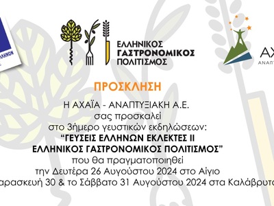 H Αχαΐα - Αναπτυξιακή Α.Ε. προσκαλεί το κοινό στο 3ήμερο Εκδηλώσεων με τίτλο “Γεύσεις Ελλήνων Εκλεκτές ΙΙ – Ελληνικός Γαστρονομικός Πολιτισμός”, οι οποίες εντάσσονται στο πρόγραμμα των «Οινοξένεια 2024», και θα πραγματοποιηθούν στις 26 Αυγούστου 2024 στο Αίγιο και το διήμερο 30 - 31 Αυγούστου 2024 στα Καλάβρυτα.